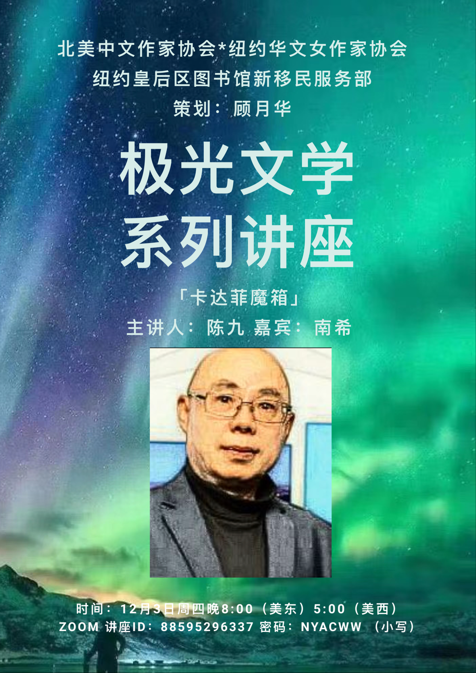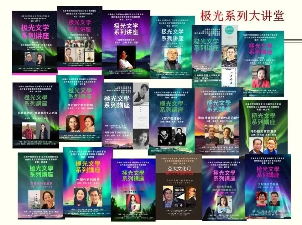 「极光文学系列讲座」由纽约华文女作家协会创始人顾月华策划,北美中文作家协会、纽约华文女作家协会和纽约皇后区图书馆新移民服务部联合举办,以陈曦、纽约桃花、南希和顾月华为主的工作团队,从2020年10月底至2021年二月中旬,有叶周、少君、纽约桃花、陈九、瑞琳、王渝和陈屹等二十几位华裔作家参与讲座,每隔两周邀请一位华裔作家主讲。紐約龍出版的出版人紐約桃花擔任「極光文學系列講座」的海報設計以及技術支持。
