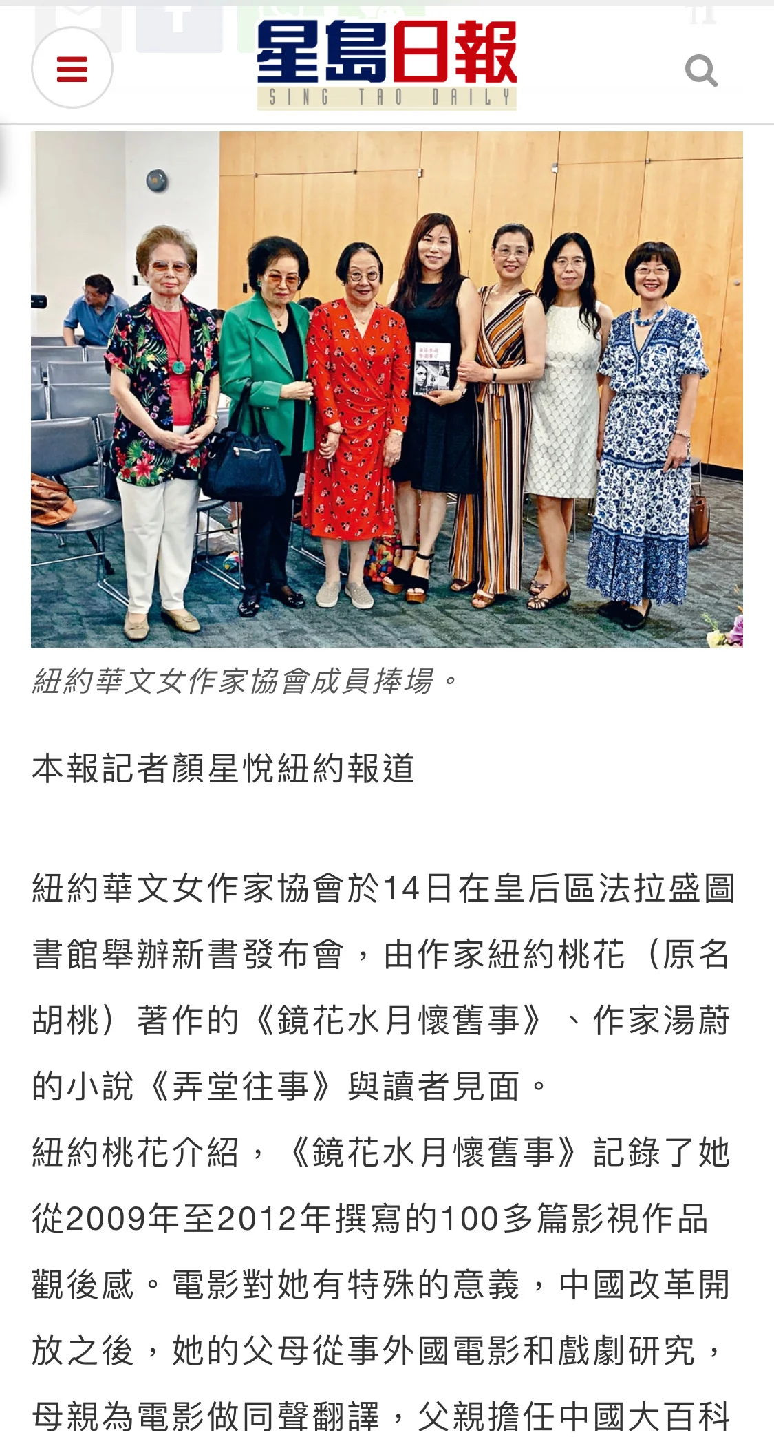 在出版這本文集之前,紐約桃花已出版個人著作有非虛構傳記《上海浮生若夢》(再版為《浮生上海》)、電影筆記《鏡花水月懷舊事》、小說集《上海浮生若夢》(再版為《浮生上海》)、電影筆記《鏡花水月懷舊事》、小說集《上海以北,北京以南》、詩集《紐約秋風與明月》,主編過詩集《紐約流光詩影》及藝術藝術村的藝術藝文。她曾獲2020年「海外著述獎」新聞寫作評論首獎。