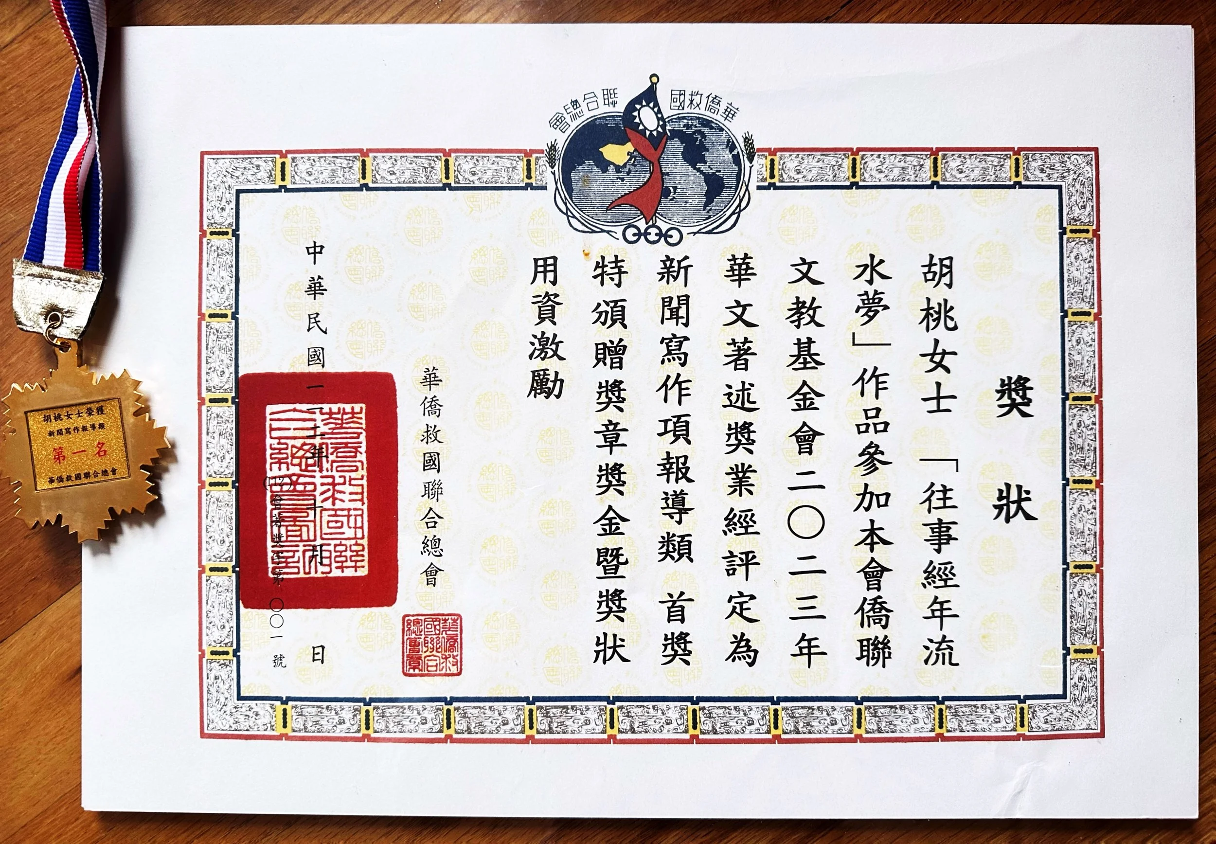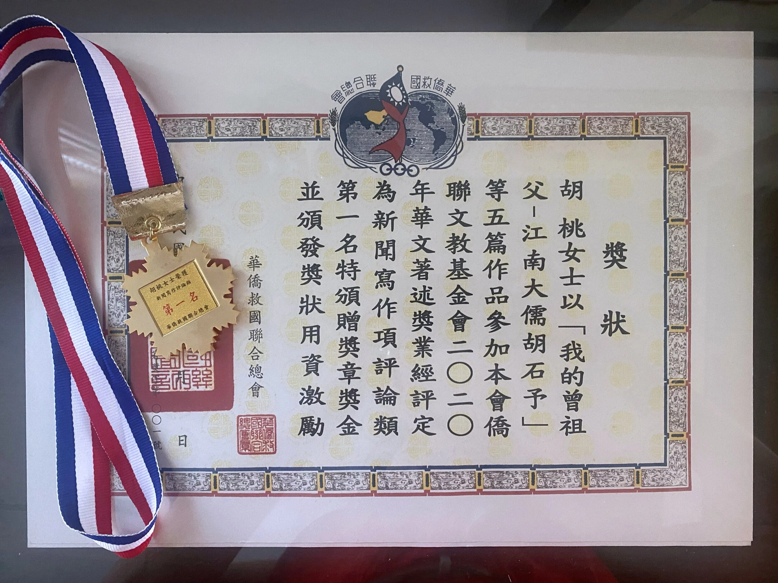 新聞寫作評論類第一名:美國胡桃(女)「我的曾祖父-江南大儒胡石予」等五篇;華僑救國聯合總會109年海外華文著述獎揭曉,辛金順、任安蓀、蔡季男、杜湛青、鄺君儀、胡桃等6人,分獲學術論著社會人文科學類、文藝創作散文類、文藝創作詩歌類、文藝創作小說類及新聞寫作報導類、新聞寫作評論類首獎。
