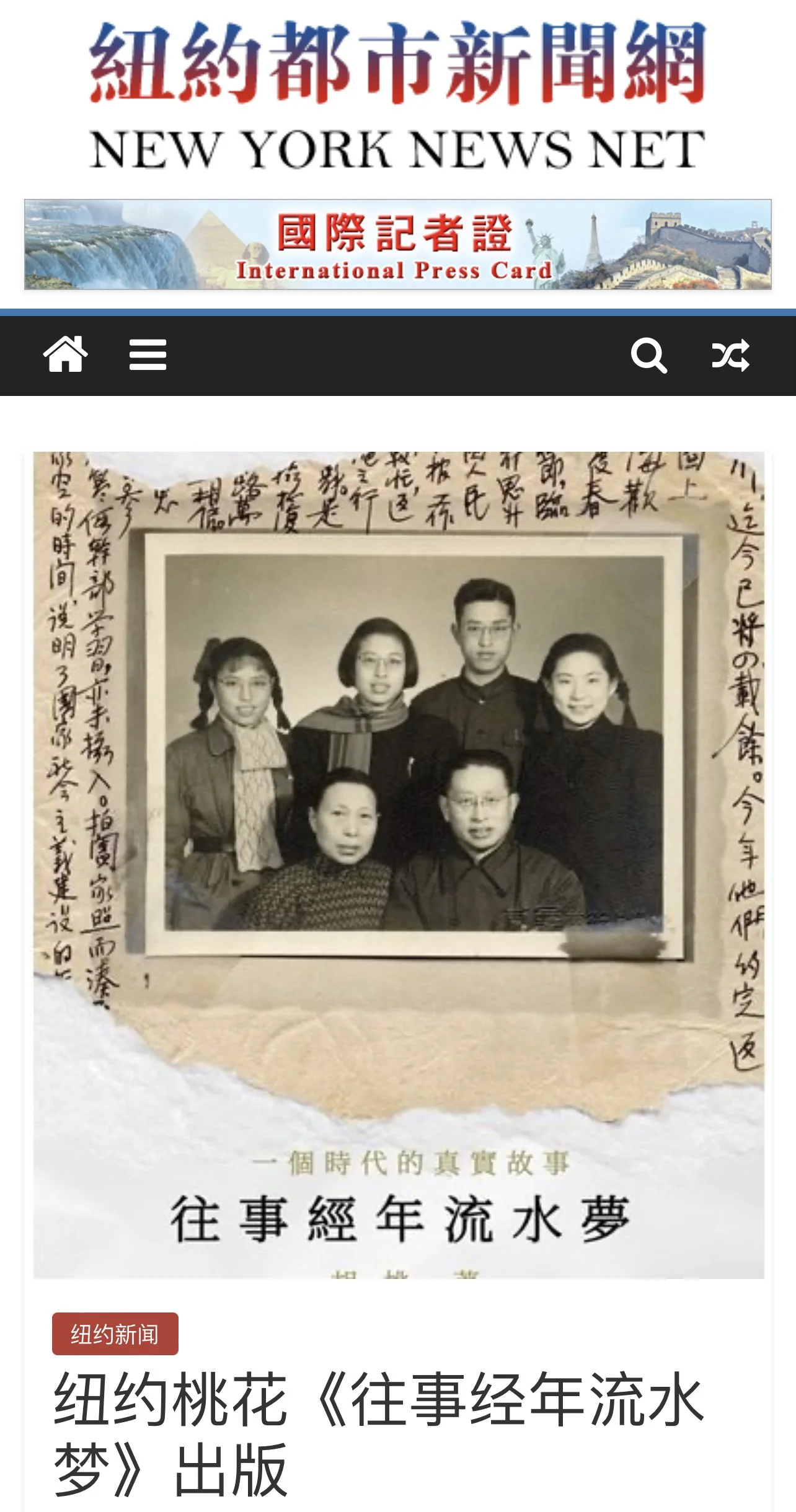【紐約都市新聞網特約記者周曉輝報道】居住在紐約的華文作家紐約桃花非虛構文集《往事經年流水夢》於近日由美國龍出版社出版。這本文集是她的第一本非虛構傳記文學專集,收錄了紐約桃花近年來撰寫的19篇非虛構紀實文章,其中14篇刊登在台灣《傳記文學》期刊上。