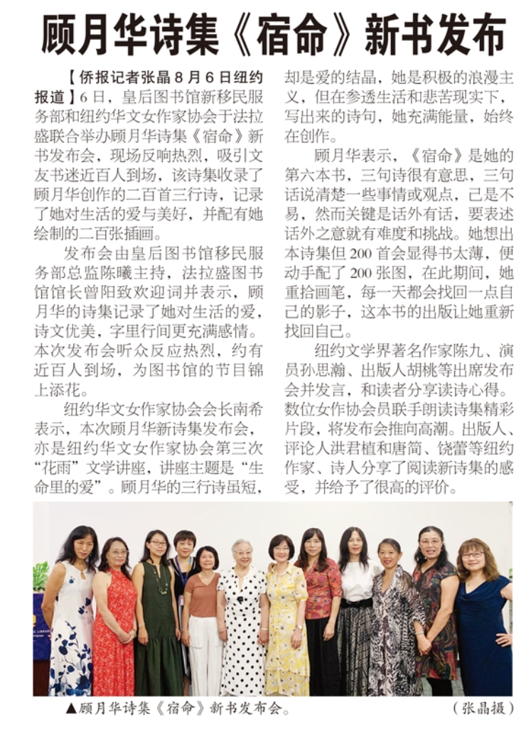 侨报记者张晶8月6日纽约报道】6日,皇后图书馆新移民服务部和纽约华文女作家协会于法拉盛联合举办顾月华诗集《宿命》新书发布会,现场反响热烈,吸引文友书迷近百人到场,该诗集收录了顾月华创作的二百首三行诗,记录了她对生活的爱与美好,并配有她绘制的二百张插画。